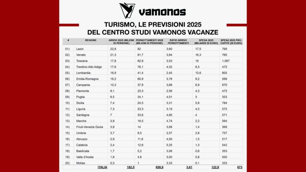 Tenuto conto dell’Anno Santo ed elaborando le serie storiche dei flussi turistici nel nostro Paese in base a dati Istat, Bankitalia e dati interni, Vamonos-Vacanze.it, la piattaforma specializzata in vacanze per single, ha stimato gli arrivi, le presenze e la spesa turistica del 2025 in Italia, regione per regione.